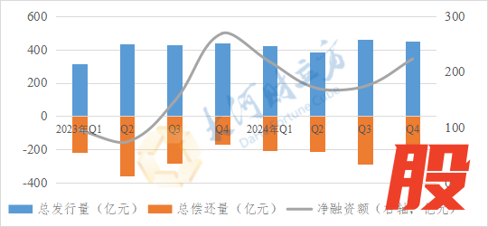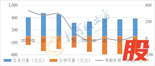 2024年,中央层面的化债政策总体延续“严格控制增量、稳妥化解存量”监管基调,城投债发行审核趋严,河南省城投债到期兑付量较大叠加提前兑付部分,城投债净融资有所收缩。
