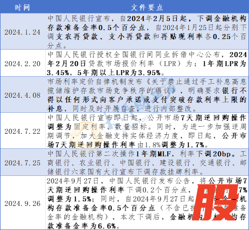 2024年,央行两次降准降息,两次降准共1个百分点,提供长期流动性超过2万亿元。两次降息则分别于7月和9月下调公开市场7天期逆回购操作利率0.1个和0.2个百分点至1.7%和1.5%,引导1年期及5年期以上LPR分别累计下降0.35个百分点和0.6个百分点,带动存贷款利率下行。9月政策利率下调幅度为近4年最大,是央行加大财政货币逆周期调节力度、支持性货币政策重要体现。