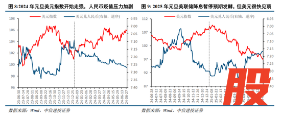 虽然每年开年市场表现和背后的原因各有不同,但我们认为过去两年市场开年下跌有一个共性原因来自全球流动性变化和人民币的贬值压力。其中,2024年元旦期间正值美元指数由降转升的关键时点,美国通胀粘性和经济基本面韧性是美联储货币政策预期调整的重要原因。这导致美元指数在2024年上半年明显走强,给人民币汇率较大的贬值压力,也推动A股开年后明显走弱,后续甚至演变为小微盘的流动性危机。2025年元旦市场的波动则与美联储降息周期暂停的预期相关,这推动美元指数阶段性走强,中国央行降准降息政策则为人民币带来阶段性贬值压力。不过,这一冲击仅带来A股短暂的下跌,市场很快在半年线附近企稳,随着特朗普再次上台,美元进入新一轮下行周期,A股则延续牛市行情。